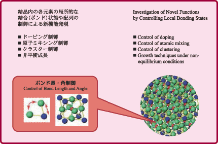 結晶内の各原子の局所的な配列制御による新機能の発現を目指すもので、結晶を構成する原子配列制御技術開発および新機能探索に重点を置いています。化合物結晶や混晶等の多元の元素からなる物質では、組成、結晶構造などの材料を特徴づけるマクロなパラメータのみならず、各原子の局所的な配列も大きく機能を決定することが分かってきています。このため、各原子の局所的な配列を制御することにより、新機能を有する材料開発が可能となります。結晶ボンドエンジニアリング研究部門では局所配列に関する基礎研究のみならず、応用研究においてもインパクトのある研究を推進しています。